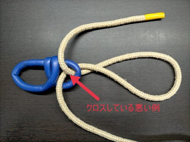 できるだけ、アイ(穴)の内側で「ラインの上にラインがクロス」して重ならないようにする手順を解説しています。